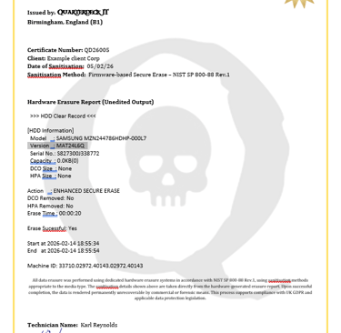 For every batch of equipment processed, we issue a Certificate of Data Destruction, which includes: