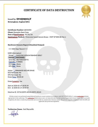 Depending on the type of storage device, we use industry-recognised sanitisation methods in line with standards such as NIST SP 800-88 Rev.1 and legacy DoD guidance where appropriate.
